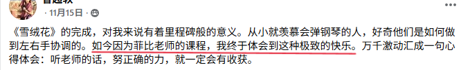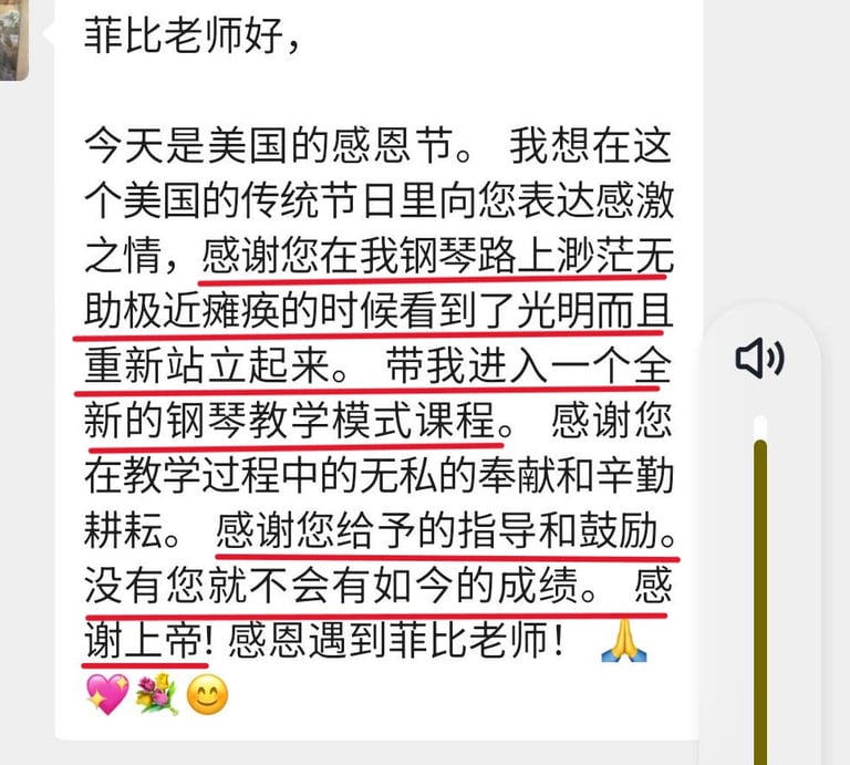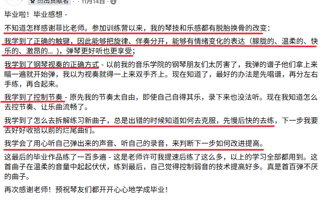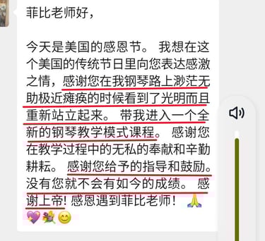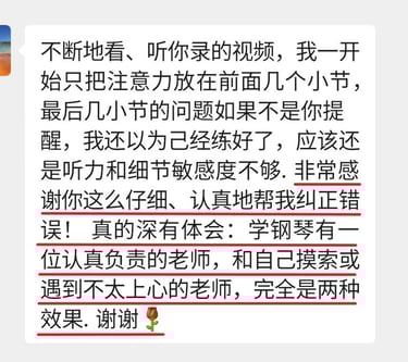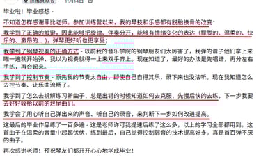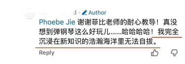 菲比老师教学严谨,认真负责,将这份钢琴课程赋予了鲜活的使命,让我深觉感恩遇见这样一位严师密友。