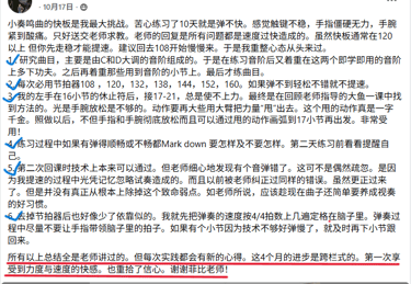 这堂课不仅让我学到了手腕如何放松,还深刻的体会到了节拍的重要性,在练习过程中老师指导我使用节拍器,曲子练熟后再撤掉,节奏准确又自然